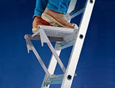 The movable work platform fits on any rung and is designed to support up to 300 pounds of anything from paint to people. Our unique design makes it tuck away when not needed yet easily moved into place with your foot when needed.